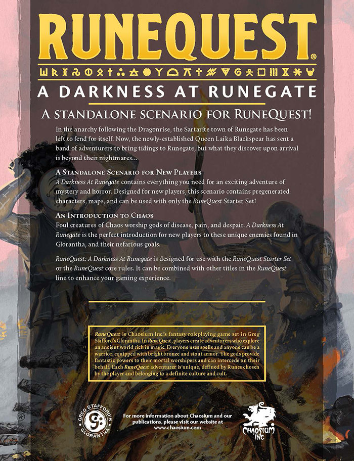 | CHA4060-PDF | A Darkness at Runegate | 2026 | Chaosium | PDF only |