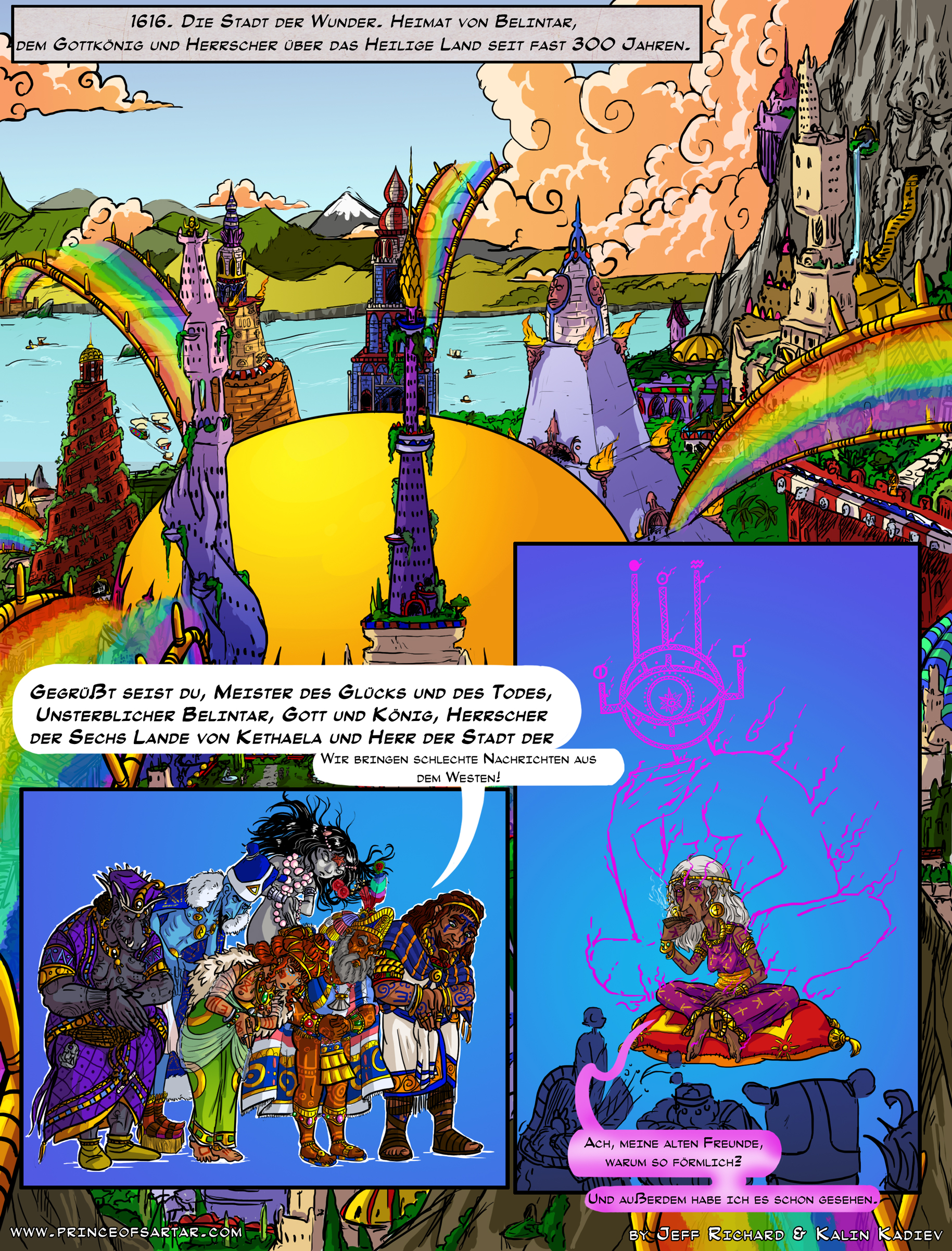 Here we see the representatives of the Six Lands of Holy Country present themselves to Belintar the God-King. They are: